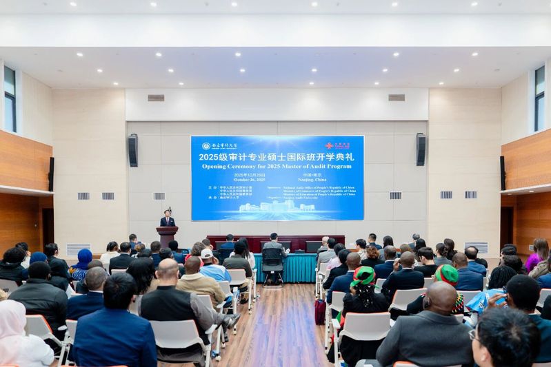 10月25日上午,南京审计大学2025级审计专业硕士国际班开学典礼在审计署审计干部教育学院举行。商务部国际商务官员研修学院刘如涛副院长和审计署国际合作司周洵副司长,我校海外院长、世界知识产权组织原总干事弗朗西斯·高锐,我校党委书记董必荣,党委副书记、校长陆华良,党委常委、副校长李乾文、姜海出席。2025级审计专业硕士国际班全体留学生参加。