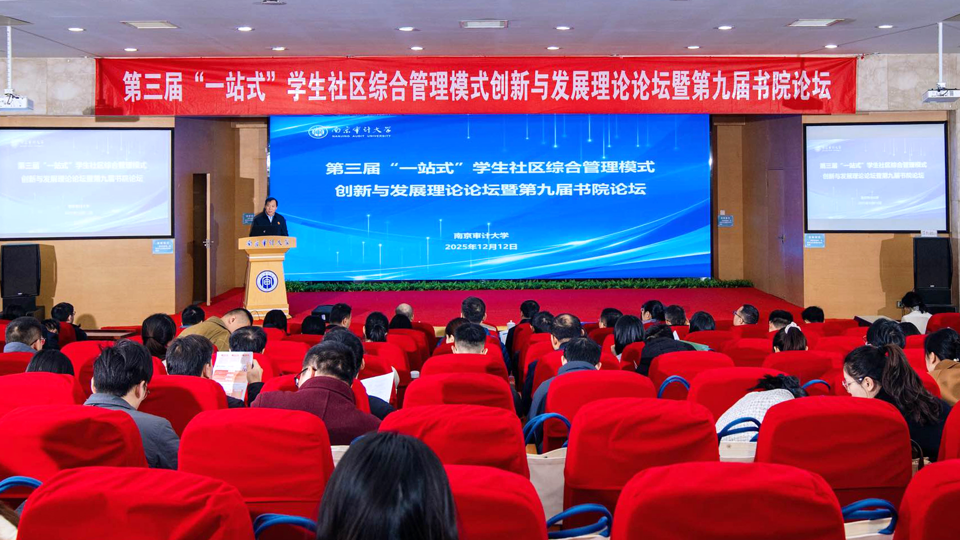 12月12日,由我校主办的第三届“一站式”学生社区综合管理模式创新与发展理论论坛暨第九届书院论坛在敏达学术报告厅召开。南京审计大学党委书记董必荣出席论坛并致开幕词,党委副书记陈中建主持仪式。学校各学院、书院、职能部门负责人、全体辅导员,以及来自全国40所高校的代表200余人参会。