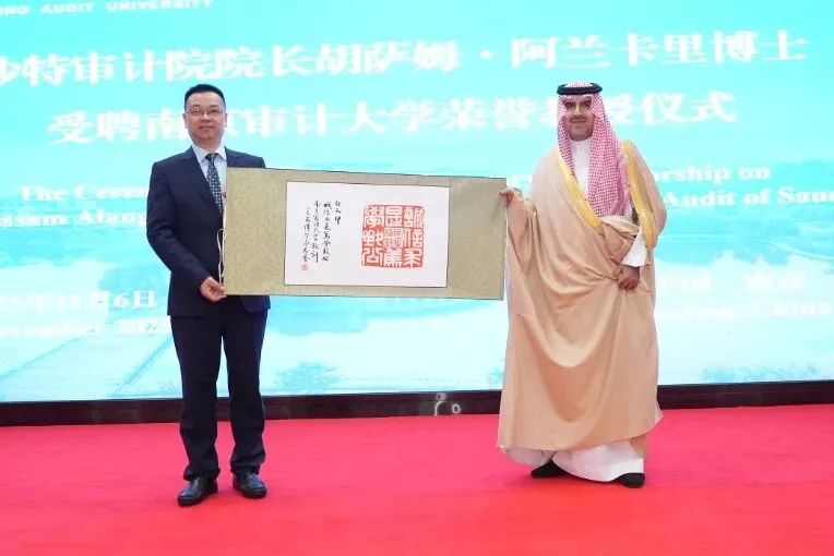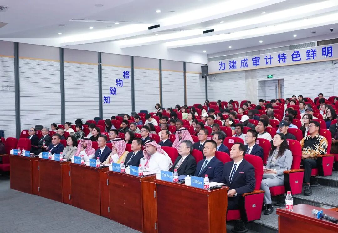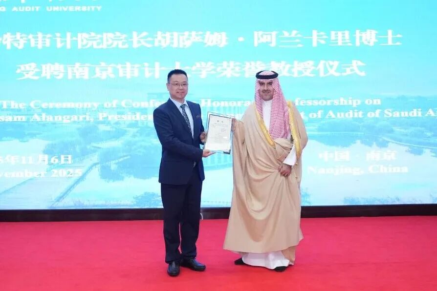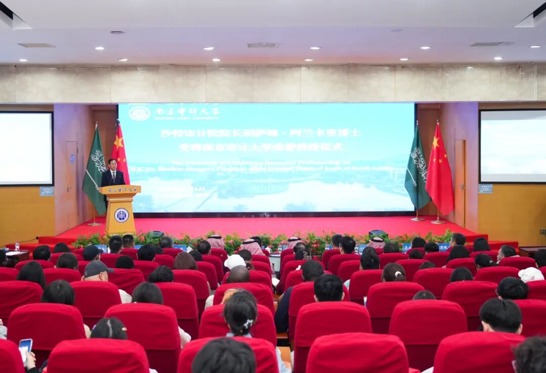 沙特审计院院长阿兰卡里教授致辞。他表示,受聘为南京审计大学荣誉教授,他深感自豪,更觉责任重大,这将激励他为深化沙特审计院与南审的合作贡献力量。阿兰卡里教授围绕沙特审计院的独立性、审计领域覆盖及国际影响力发表了主题演讲。他从沙特经济转型背景出发,系统阐述了沙特审计院在监督政府财政、评估政策绩效及优化公共资源方面的核心职能。他表示,沙特审计院在国际上不仅担任世界审计组织等多边机构的重要职务,牵头多项区域及国际审计事务,未来还将承担更多领导角色,持续提升其全球影响力。