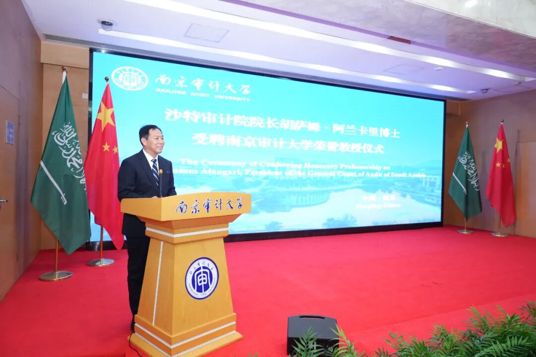 校党委书记董必荣主持受聘仪式,并宣读《关于授予沙特审计院院长胡萨姆·阿兰卡里博士荣誉教授学衔的决定》。董必荣表示,沙特审计院院长阿兰卡里博士到访并受聘为我校荣誉教授必将成为南京审计大学发展历程中的重要篇章。我们将继续在中国审计署的指导下,与沙特审计行业加强交流互鉴,共同推动审计事业的发展!